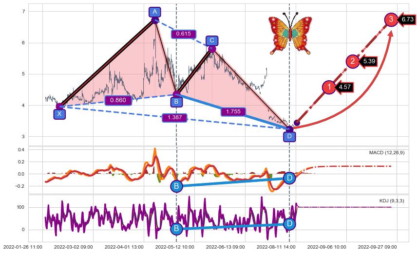 | 4 🅚:【高山滑雪】买入点 ➕ 📡:谐波蝴蝶已到达d点:猜想c下行到达d点后报复性拉升上涨(均值回复) ☞ 看多信号 ⇥ 【均线】交织【图形】⇥ 综合量化分数: 52 | > |
