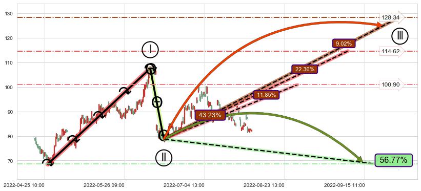 ➣ 调整浪已超过预测的c点位置,但后续大趋势循环浪高概率反转下跌,继续上涨概率43.23%,谨慎做多