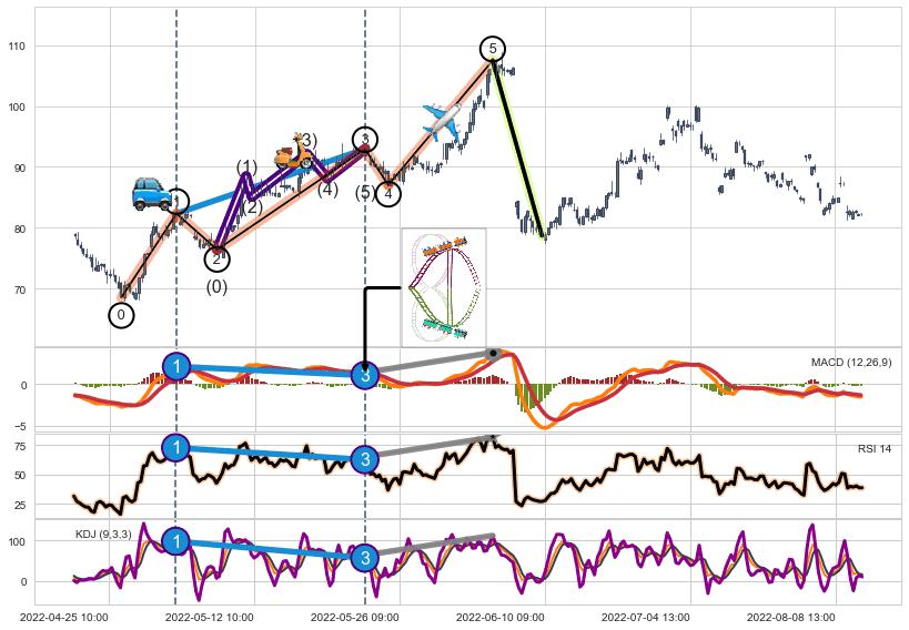 ➢ 1,3,5驱动浪MACD, RSI, KDJ走势都出现【常规背离】反转信号增强