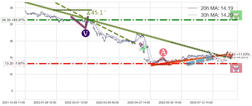 ➣ 2022-04-28 13:00-2022-07-13 14:00上升趋势存在反转[风险],其原上升趋势的支撑位(15.92)已破位[强阻力信号],原上升趋势角度: 36.2˚
