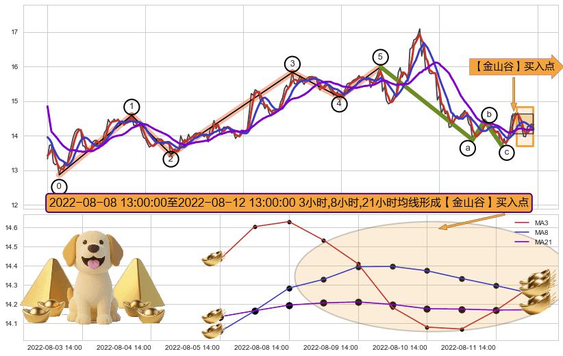 从2022-08-02 14:00至2022-08-12 14:00,共包含17个小时,阶段股价上涨4.73%,阶段股价变动位移路程比: 1 : 3