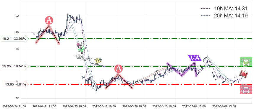 ♘ 阻力价格位19.21,可信任强度69.59%,距离最后交易2022-08-12 14:00形成的收盘价格14.34相差 +33.96%