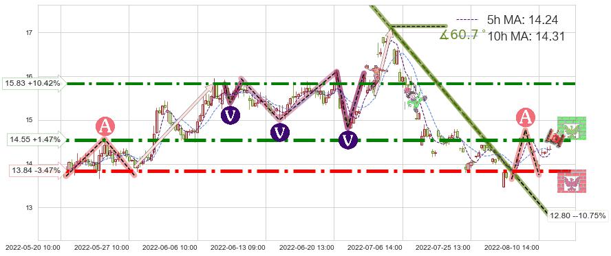 ♘ 阻力价格位14.55,可信任强度85.60%,距离最后交易2022-08-12 14:00形成的收盘价格14.34相差 +1.47%
