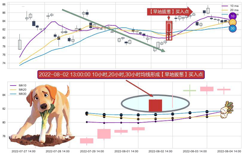 ⚀ 2022-08-02 13:00:00小时显现 10小时-20小时-30小时均线 【旱地拔葱】买入点 看多信号,后市看涨,买入