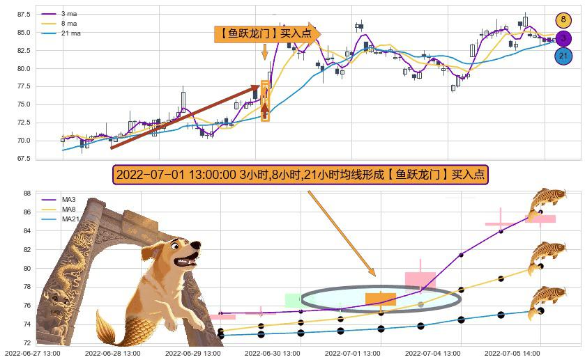 ⚀ 2022-07-01 13:00:00小时显现 3小时-8小时-21小时均线 【鱼跃龙门】买入点 看多信号,后市看涨,买入