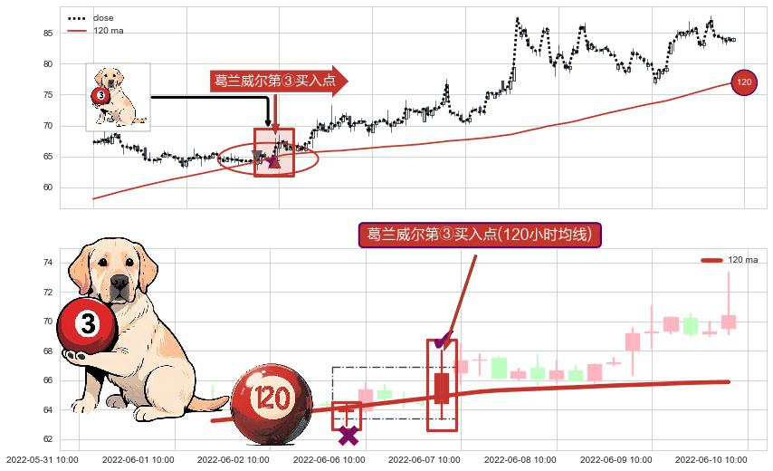 ⚀ 2022-06-07 09:00:00-小时显现 葛兰威尔均线 120小时均线 第③买入点 上升趋势的中继信号,后市看涨,买进信号