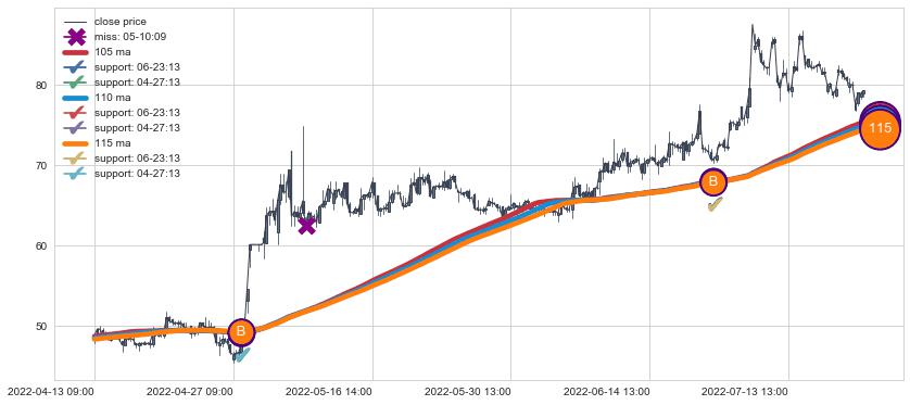⚅ 买点向上突破均线后,价格走势有持续向上的迹象,但动能稍显不足,迟迟不能远离均线