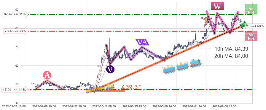 ♘ 在最后的上升阶段2022-04-26 13:00至2022-07-12 14:00存在 持续未破位的支撑位 ,支撑价格81.18,支撑可信任强度77.88%,其距离最后价格84.10相差 -3.48%