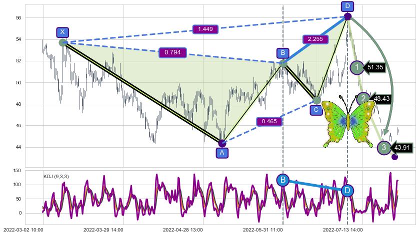 ➣ 已完成【蝴蝶】形态起点X: 03-09:09, 终点D: 06-30:13, 共358交易小时
