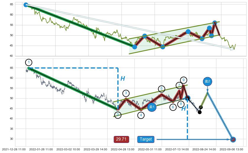 从2021-12-30 13:00至2022-08-12 14:00,共包含634个小时,阶段股价下跌-30.58%,阶段股价变动位移路程比: 1 : 17,下跌趋势角度: 23.7