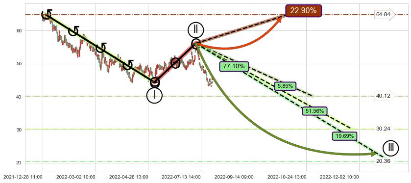 ➣ 调整浪已超过预测的c点位置,后续大趋势循环浪继续下跌概率77.10%,谨慎做多