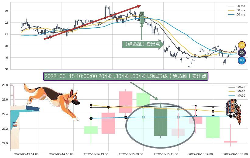 ⚀ 2022-06-15 10:00:00小时显现 20小时-30小时-60小时均线 【绝命跳】卖出点 看空信号,后市看跌,卖出