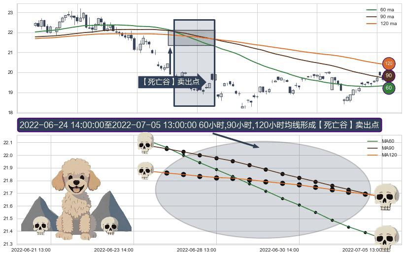 ⚀ 2022-06-27 13:00:00-小时至2022-07-05 13:00:00-小时显现 60小时-90小时-120小时均线 【死亡谷】卖出点 看空信号,后市看跌,卖出