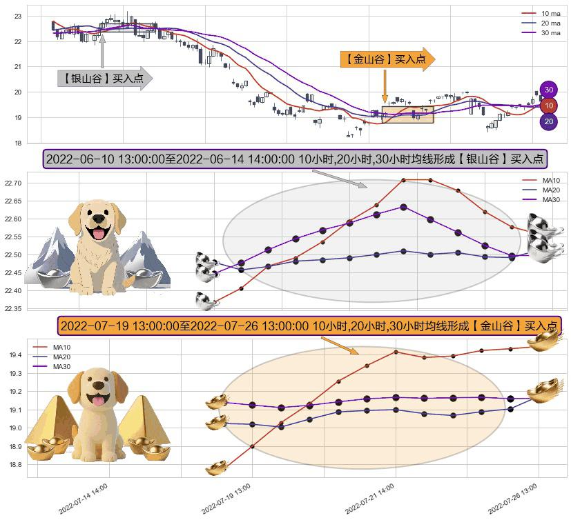 ⚃ 2022-07-19 14:00:00-小时至2022-07-26 13:00:00-小时显现 10小时-20小时-30小时均线 【金山谷】买入点 其再次确认了买入信号,可靠性更强,买入