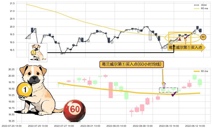⚀ 2022-08-09 13:00:00-小时显现 葛兰威尔均线 60小时均线 第买①入点 走势反转见底信号,后市看涨,买进信号