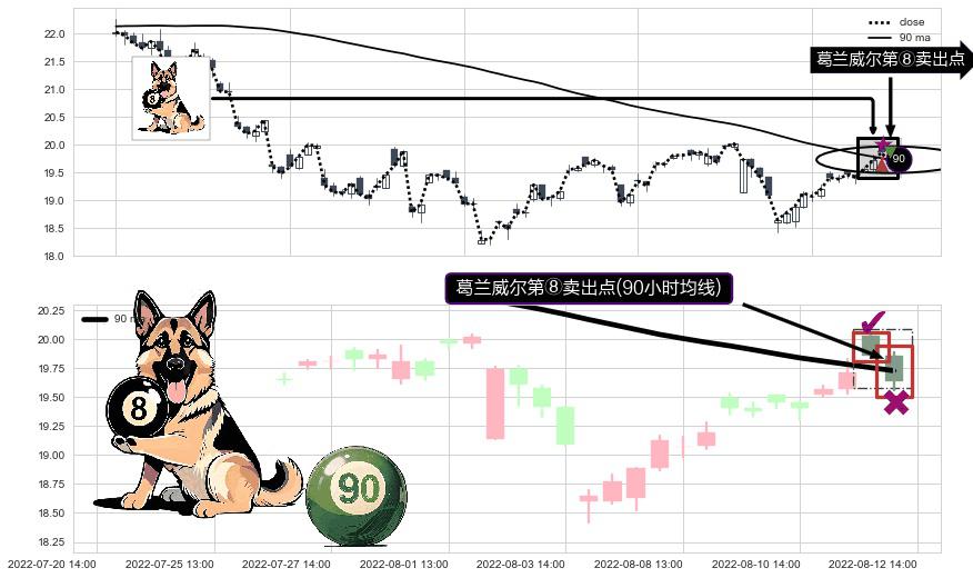 ⚀ 2022-08-12 14:00:00-小时显现 葛兰威尔均线 90小时均线 第⑧卖出点 下降趋势的中继信号,后市看跌,卖出信号