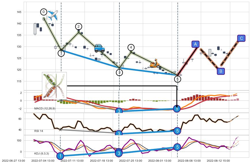 ➢ 1,3,5驱动浪MACD, RSI, KDJ走势都出现【常规背离】反转信号增强