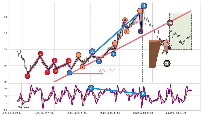 从2022-08-04 13:00至2022-08-12 14:00,共包含14个小时,阶段股价上涨5.88%,阶段股价变动位移路程比: 1 : 1.2