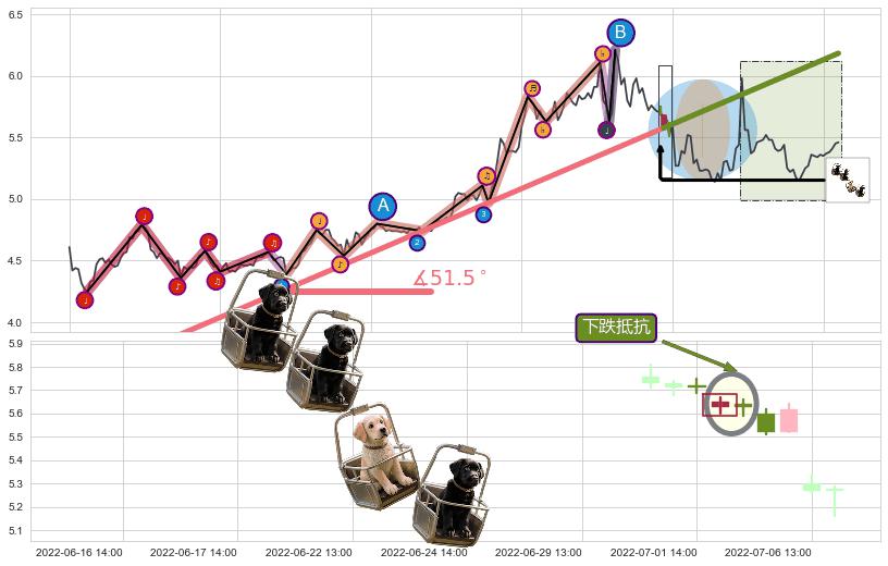 ➢ 最后的上涨趋势2022-04-27 09:00至2022-07-04 13:00:存在破位迹象,后续小调整或者反转下跌
