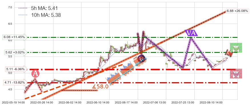 ♘ 阻力价格位5.62,可信任强度68.54%,距离最后交易2022-08-12 14:00形成的收盘价格5.46相差 +3.02%