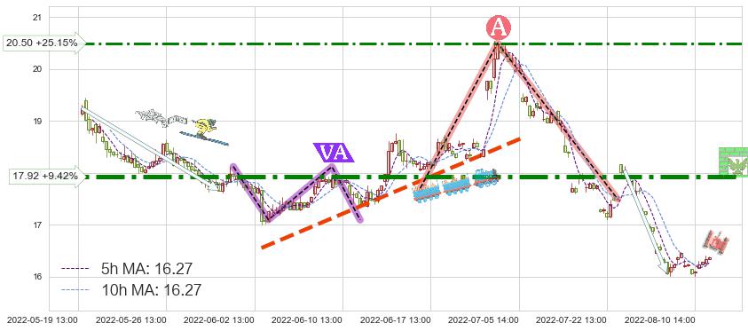 ♘ 阻力价格位17.92,可信任强度88.51%,距离最后交易2022-08-12 14:00形成的收盘价格16.38相差 +9.42%
