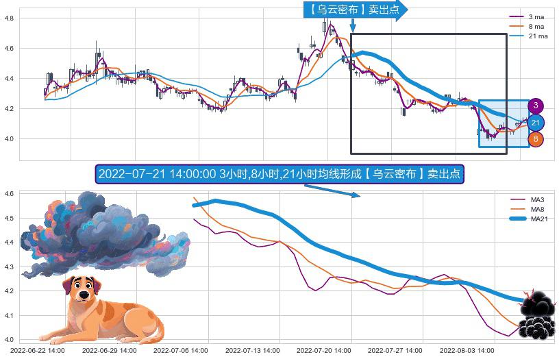 ⚀ 2022-07-05 14:00:00小时-2022-08-09 13:00:00小时显现 3小时-8小时-21小时均线 【乌云密布】卖出点 看空信号,后市看跌,卖出