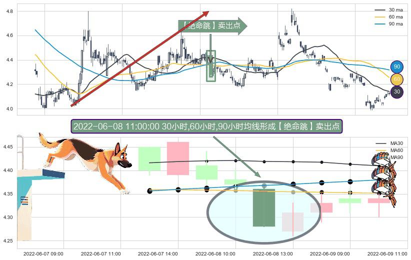 ⚀ 2022-06-08 11:00:00小时显现 30小时-60小时-90小时均线 【绝命跳】卖出点 看空信号,后市看跌,卖出