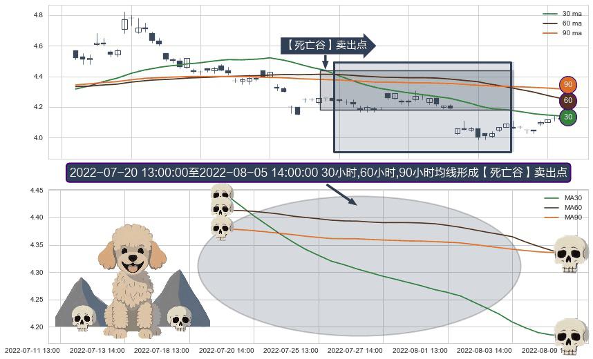 ⚀ 2022-07-20 14:00:00-小时至2022-08-05 14:00:00-小时显现 30小时-60小时-90小时均线 【死亡谷】卖出点 看空信号,后市看跌,卖出
