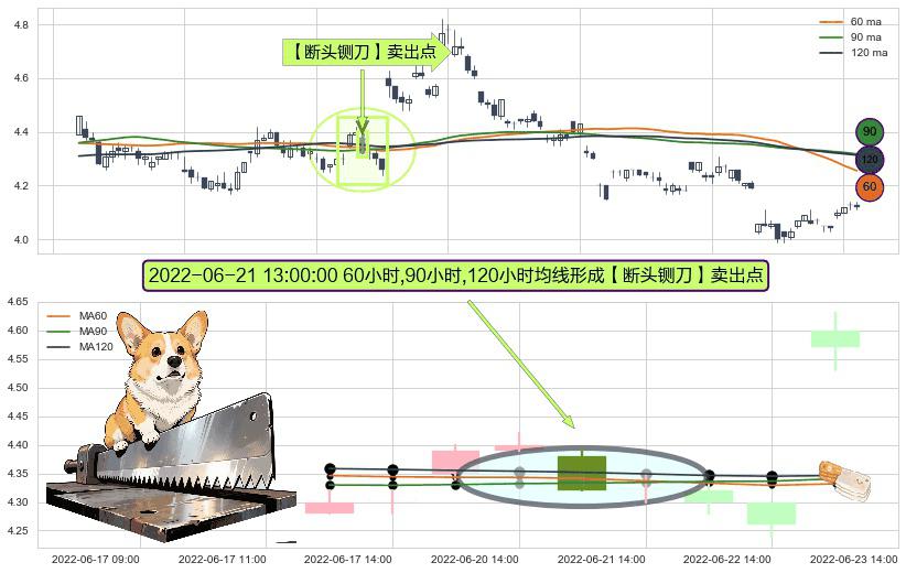 ⚀ 2022-06-21 13:00:00小时显现 60小时-90小时-120小时均线 【断头铡刀】卖出点 看空信号,后市看跌,卖出