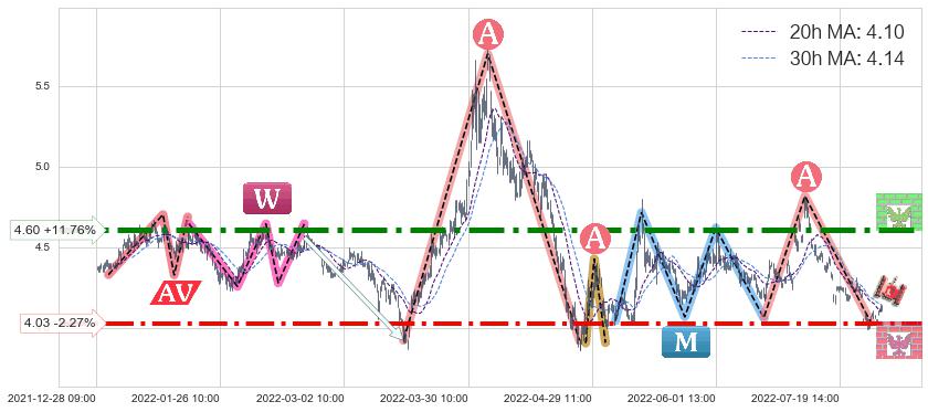 ♞ 20小时均线:4.10,30小时均线:4.14→ 快线<慢线