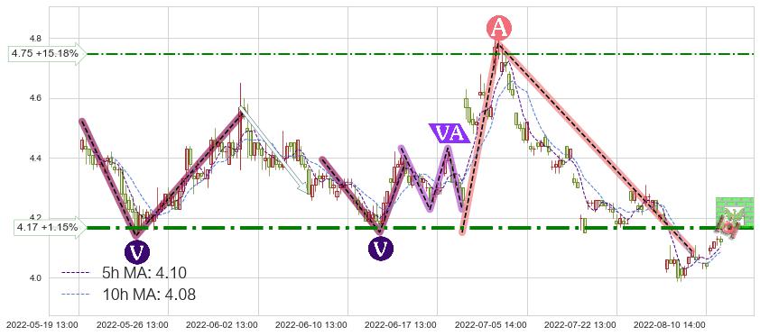 ♘ 阻力价格位4.17,可信任强度80.77%,距离最后交易2022-08-12 14:00形成的收盘价格4.12相差 +1.15%