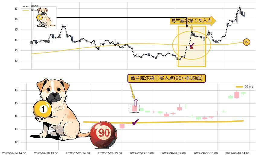 ⚀ 2022-07-27 13:00:00-小时显现 葛兰威尔均线 90小时均线 第买①入点 走势反转见底信号,后市看涨,买进信号