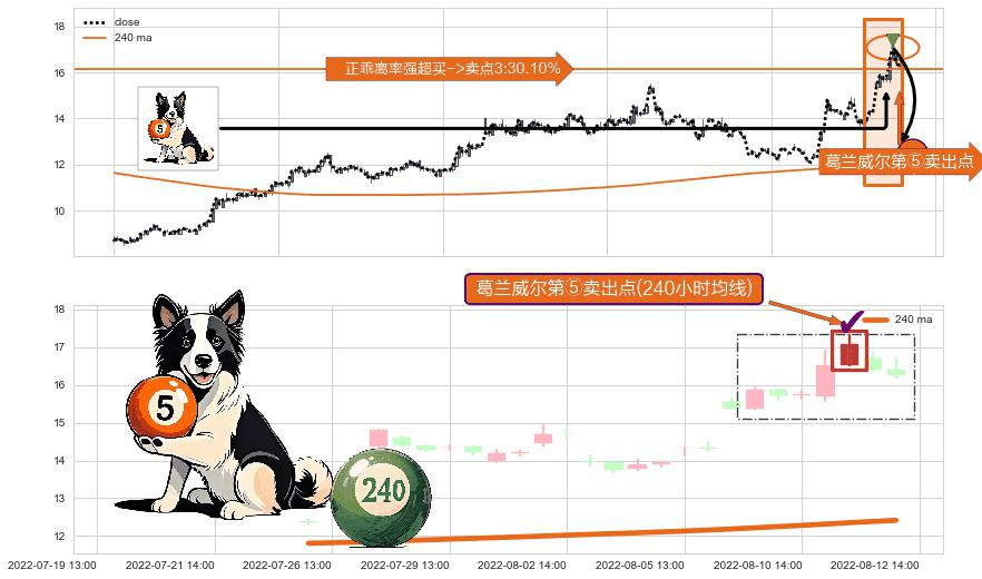 ⚀ 2022-08-11 14:00:00-小时显现 葛兰威尔均线 240小时均线 第⑤卖出点 上升趋势均值回复的短线回落信号,后市看跌,卖出信号