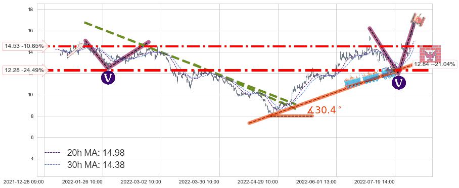 ♘ 支撑价格位14.53,可信任强度72.67%,距离最后交易2022-08-12 14:00形成的收盘价格16.26相差 -10.65%