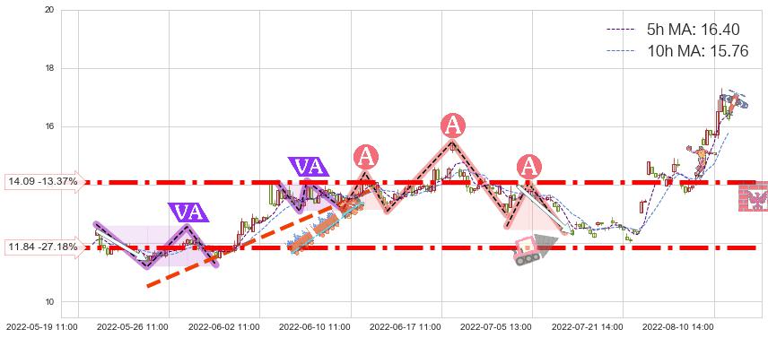 ♘ 支撑价格位14.09,可信任强度89.77%,距离最后交易2022-08-12 14:00形成的收盘价格16.26相差 -13.37%