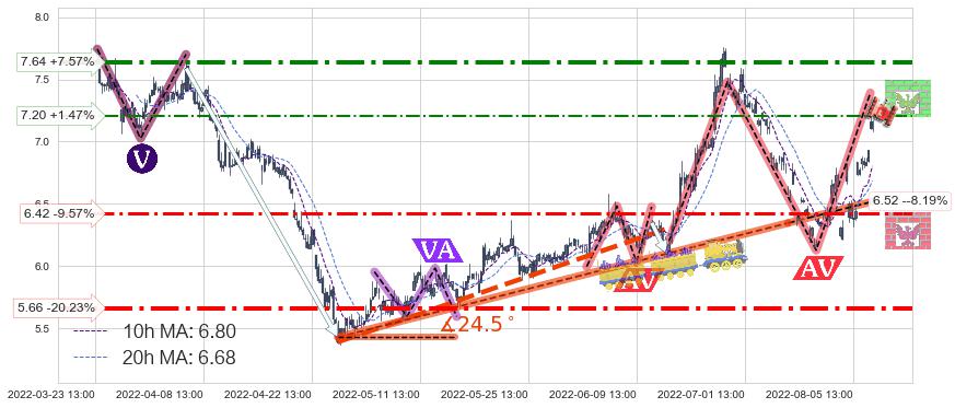 ♘ 阻力价格位7.20,可信任强度51.42%,距离最后交易2022-08-12 14:00形成的收盘价格7.10相差 +1.47%
