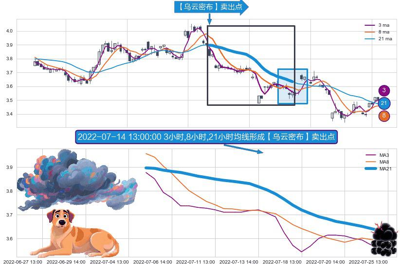 形态多维评估: ⚀ 2022-07-05 13:00:00小时-2022-07-22 14:00:00小时显现 3小时-8小时-21小时均线 【乌云密布】卖出点 看空信号,后市看跌,卖出