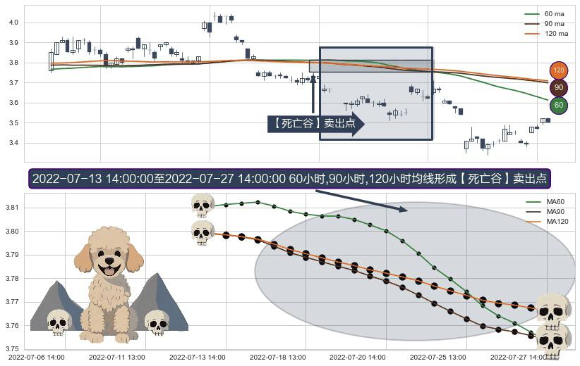 形态多维评估: ⚀ 2022-07-14 13:00:00-小时至2022-07-27 14:00:00-小时显现 60小时-90小时-120小时均线 【死亡谷】卖出点 看空信号,后市看跌,卖出