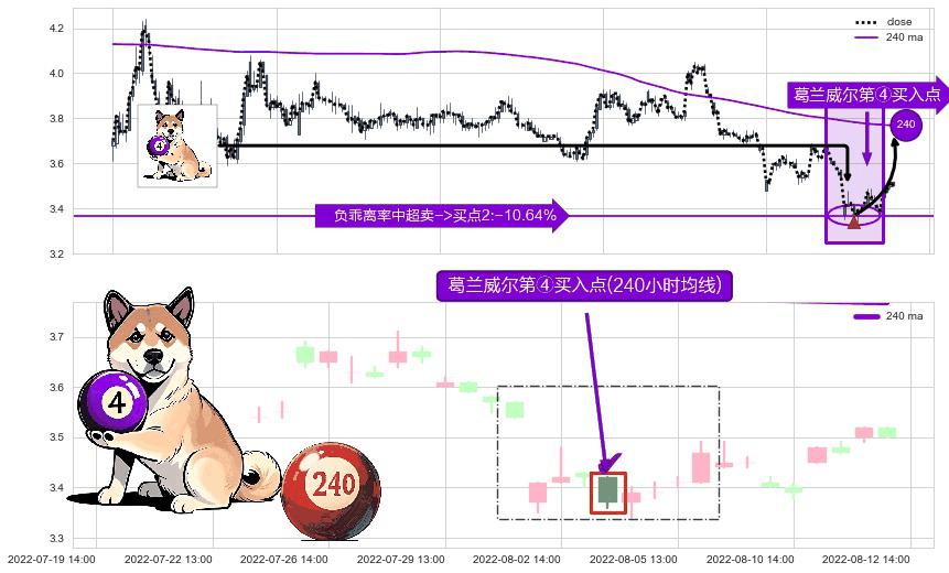 形态多维评估: ⚀ 2022-08-03 14:00:00-小时显现 葛兰威尔均线 240小时均线 第④买入点 下降趋势均值回复的短线反弹信号,后市看涨,买进信号