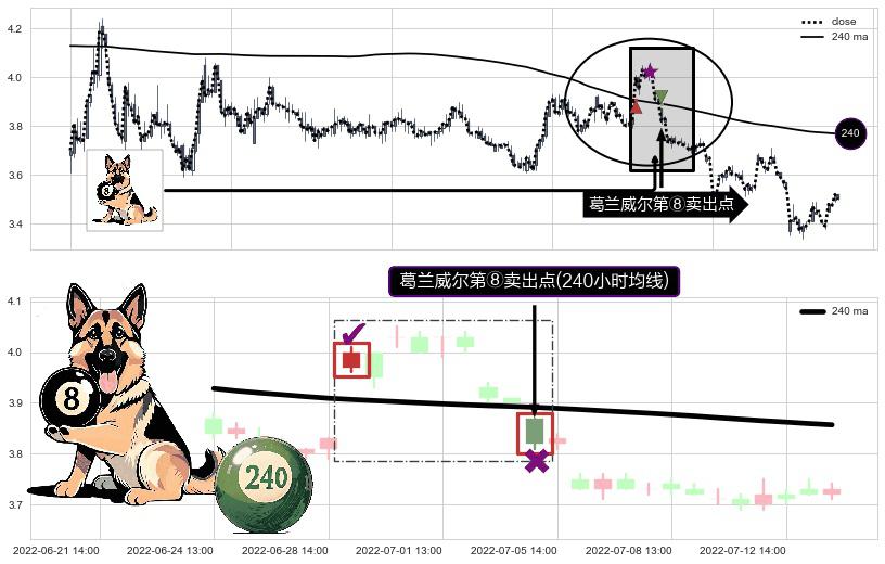 形态多维评估: ⚀ 2022-07-05 13:00:00-小时显现 葛兰威尔均线 240小时均线 第⑧卖出点 下降趋势的中继信号,后市看跌,卖出信号