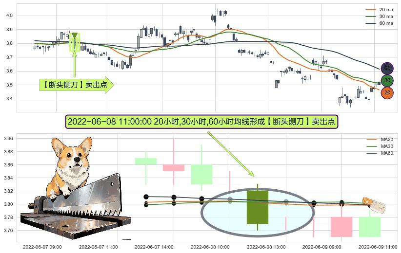 形态多维评估: ⚀ 2022-06-08 11:00:00小时显现 20小时-30小时-60小时均线 【断头铡刀】卖出点 看空信号,后市看跌,卖出