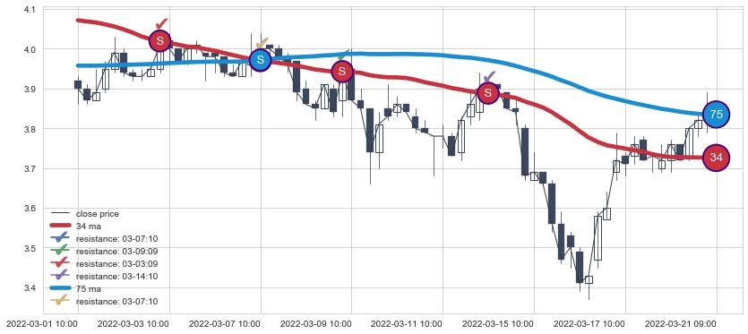下跌趋势03-01 10:00-03-21 09:00,均线34, 75确认关键阻力4处