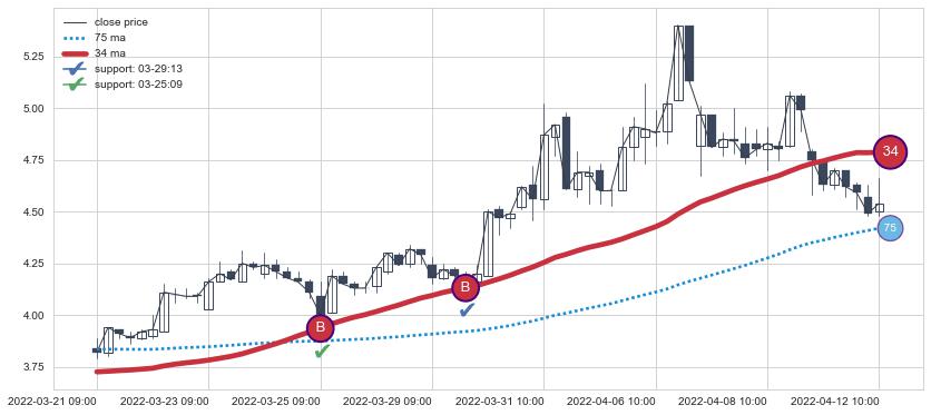 上涨趋势03-21 09:00-04-12 10:00,均线34确认关键支撑2处