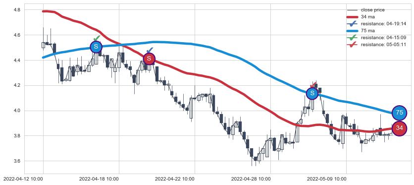 下跌趋势04-12 10:00-05-11 13:00,均线34, 75确认关键阻力3处