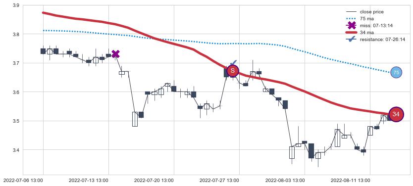 下跌趋势07-06 13:00-08-12 14:00,均线34确认关键阻力1处