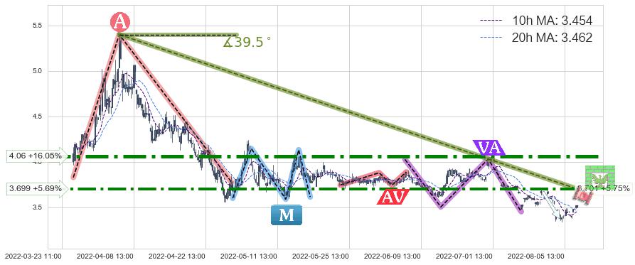 ♘ 阻力价格位3.699,可信任强度70.83%,距离最后交易2022-08-12 14:00形成的收盘价格3.500相差 +5.69%