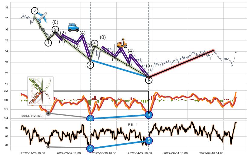 ➣ 第一, 三, 五浪下跌动能逐渐【衰弱变小】,趋势呈现不稳迹象