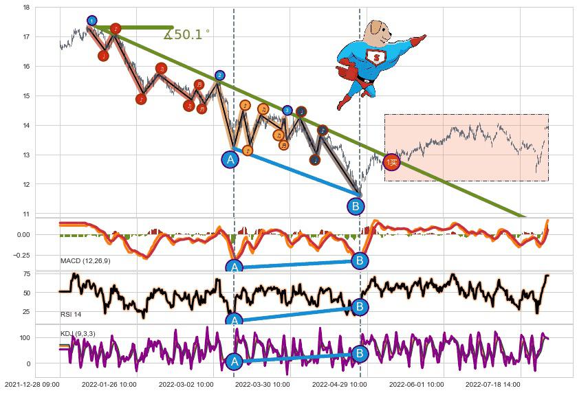 从2022-06-13 09:00至2022-06-28 14:00,共包含39个小时,阶段股价上涨0.97%,阶段股价变动位移路程比: 1 : 23