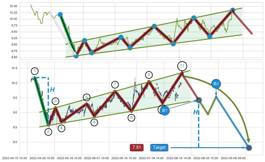 ➣ D点拟合预测价格8.94,距离最后交易收盘价格10.23相差 -12.57%