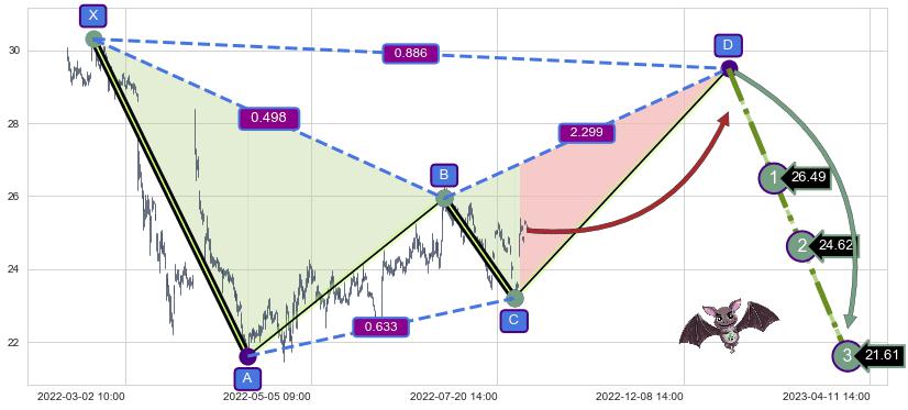 ➣ 未完成【蝙蝠】形态起点X: 02-21:11, 已到达C点: 08-02:14, 预测最终D点: 01-11:14, 共675交易小时